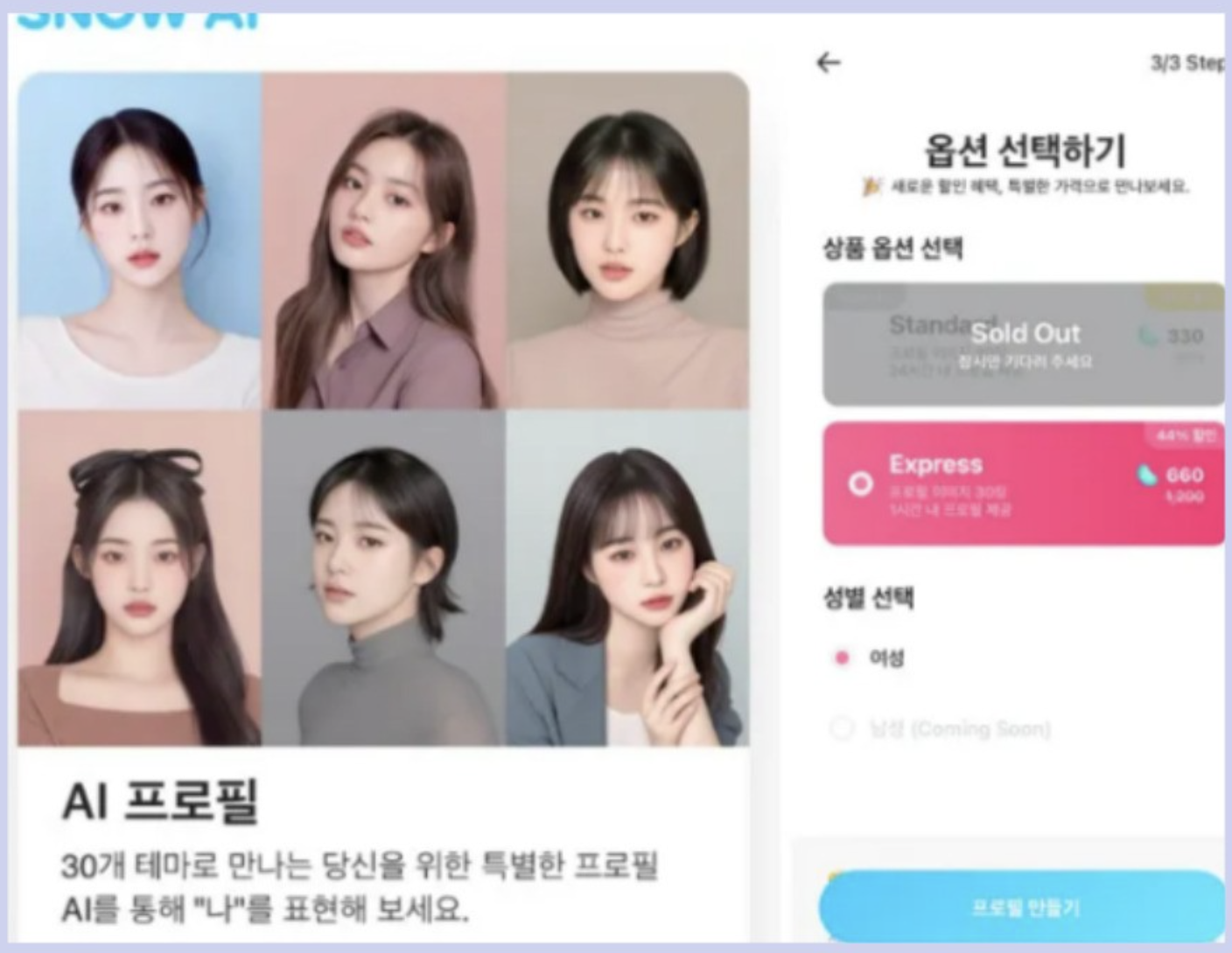 SNOW AI 프로필은 스노우 어플에서 제공하는 기능으로 "사용자의 얼굴을 기반으로 아바타를 만들어주는 서비스"로 자신이 원하는 다양한 컨셉으로 사진 결과물이 나타난다. 셀카 10~20장을 올리면 AI가 사진을 조합해 새롭게 고화질의 프로필 사진 30장을 만들어 주는 서비스다. 24시간 내 제작은 3300원, 1시간 내는 6600원을 내고 이용할 수 있다. AI가 만들어 내는 사진마다 의상과 헤어, 배경이 다른 데다가 사진 분위기에 따라 화장도 달라진다. 화장하고 머리를 손질하고 사진관에 가서 사진을 찍는 시간과 비용을 절약할 수 있어서 인기다.